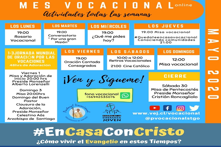 Continuará con distintas actividades todos los días. Por ejemplo, los jueves de mayo con #QuedateEnCasaVocacional, se podrán conocer cómo viven las vocaciones los sacerdotes, consagradas y consagrados de las distintas comunidades religiosas del país. Los sábados, en tanto, podrán participar de retiros. Así, cada día habrá una propuesta novedosa para que los jóvenes puedan profundizar en la materia.
