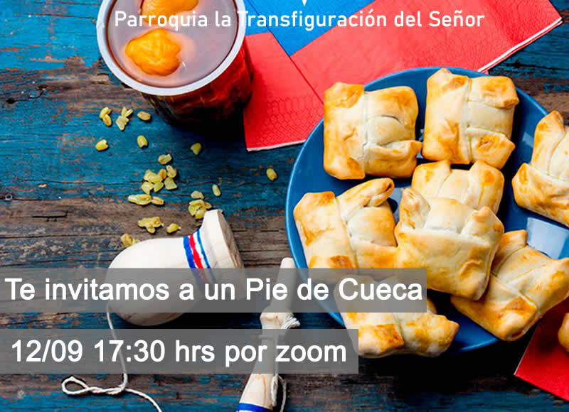 Disfruta en familia “Zoom Pie de Cueca“. Conéctate, comparte y disfruta en familia nuestra Chilenidad, este sábado 12 de Septiembre a las 17:30 hrs por zoom, luego nuestro párroco, p. Enrique, oficiará la Misa a la chilena 20:00 hrs en nuestro sitio web www.transfiguracion.cl.
