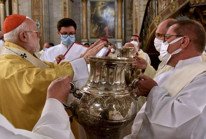Tras esta renovación de las promesas sacerdotales, fueron presentadas las ánforas con los aceites sagrados: óleo y crisma, para ser usados durante el año en la administración de los diversos sacramentos, como el Bautismo, la Confirmación, el Orden Sagrado, la Consagración de obispos, la Unción de los Enfermos y la Consagración de templos. Estos aceites fueron luego, hacia el final de la eucaristía, consagrados y bendecidos por el arzobispo, para ser distribuidos en las parroquias desde cada vicaría zonal, a partir del próximo jueves.