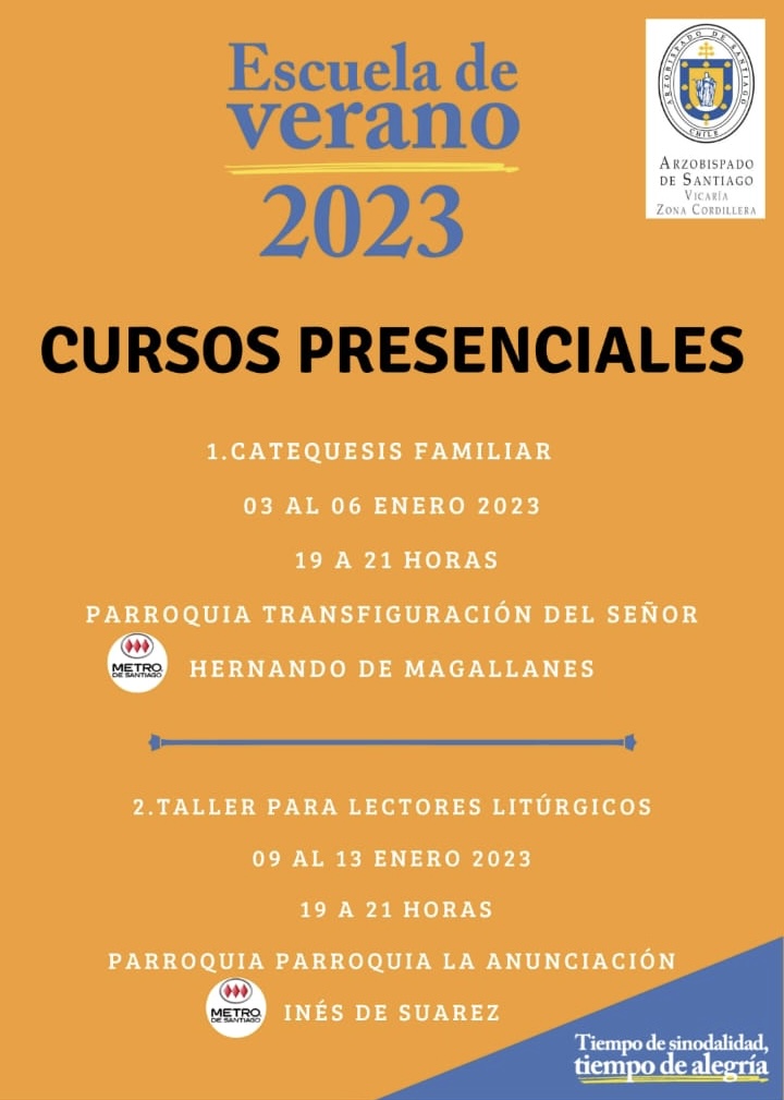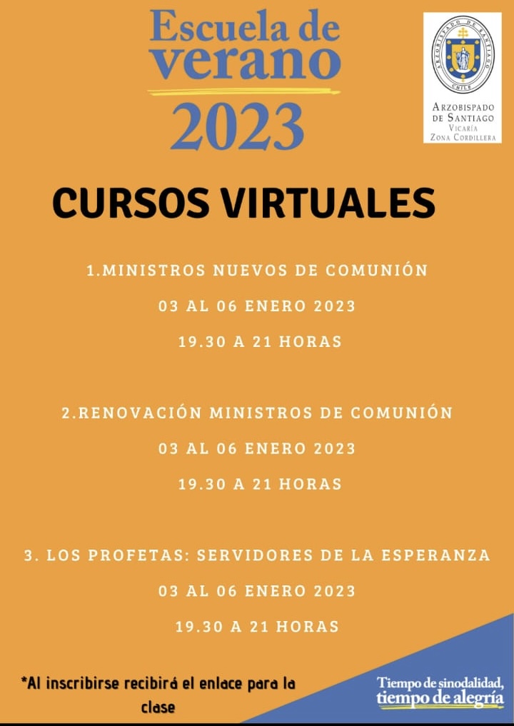 Desde el 3 al 6 de enero se realizarán cursos presenciales (en nuestra parroquia) y virtuales. Si desean inscribirsse lo pueden hacer en el siguiente link: docs.google.com/forms/d/e/1FAIpQLSehibc5K9OfC64rhRwu92aM3jhFRf2edwoukAFfypiqOg4rpg/viewform